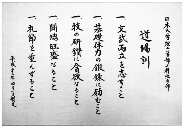 難しい精神訓ではなく、学生たる工科空手部員が、技を磨き、自らの心身を鍛える上で大切な基本となる 努力目標を、平素の心構えとして掲げた。部活動を通じて道場訓の本質が理解され、浸透していくことを望んでいる。
